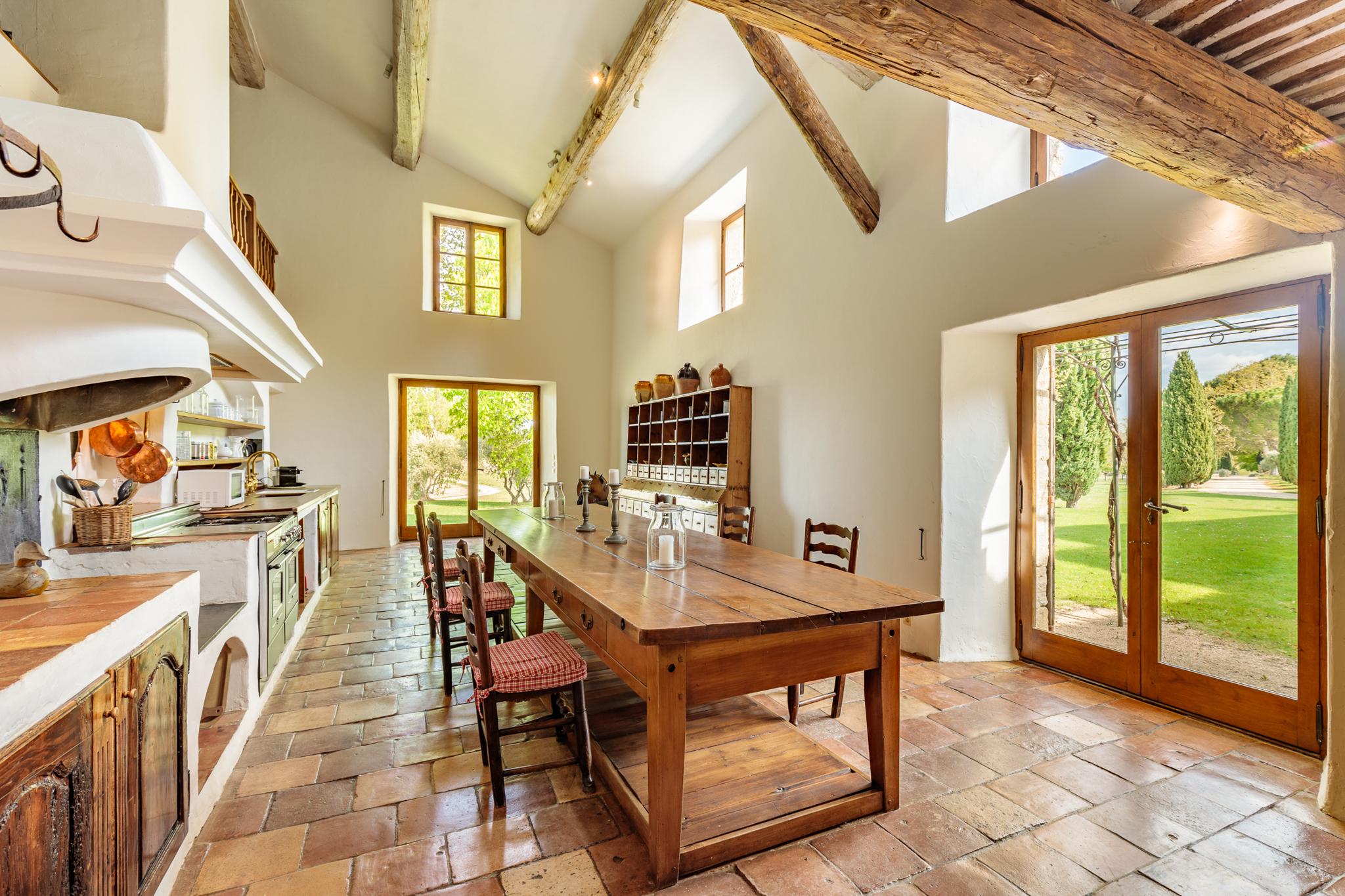 A l’arrière du parc, bénéficiant d’une entrée séparée, la bergerie peut être réservée de manière indépendante. Une vaste cuisine salle à manger dont les poutres anciennes soulignent la hauteur sous plafond, salons et salle de billard, 6 chambres doubles climatisées et 4 salles de bain. Devant la bergerie, une belle piscine de 14×5 m et la terrasse qui offrent une belle vue sur le vignoble et le Luberon.