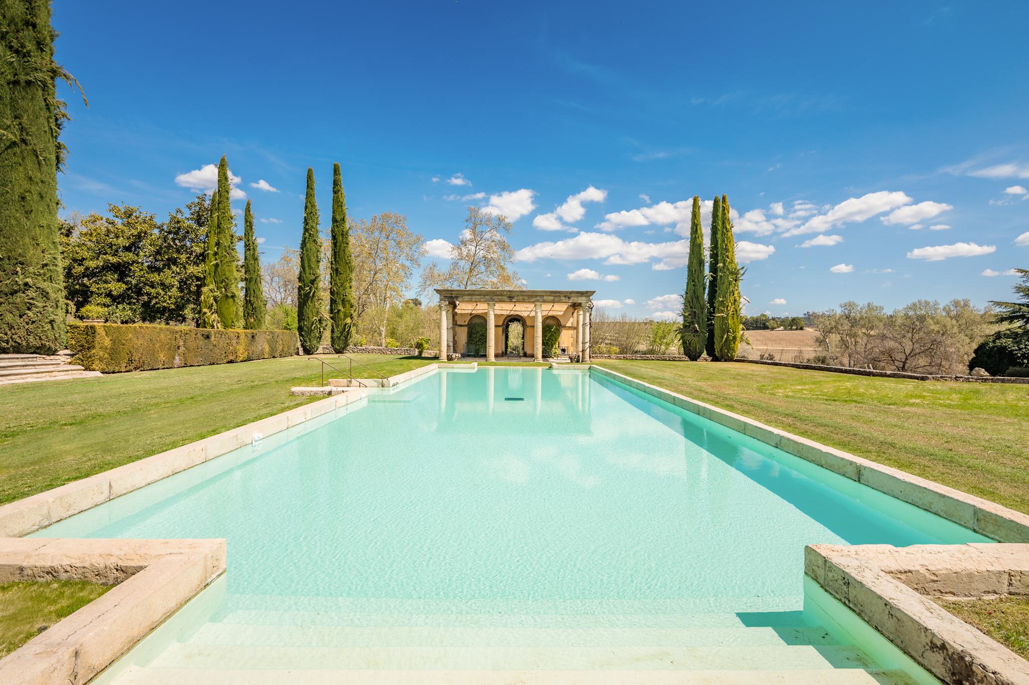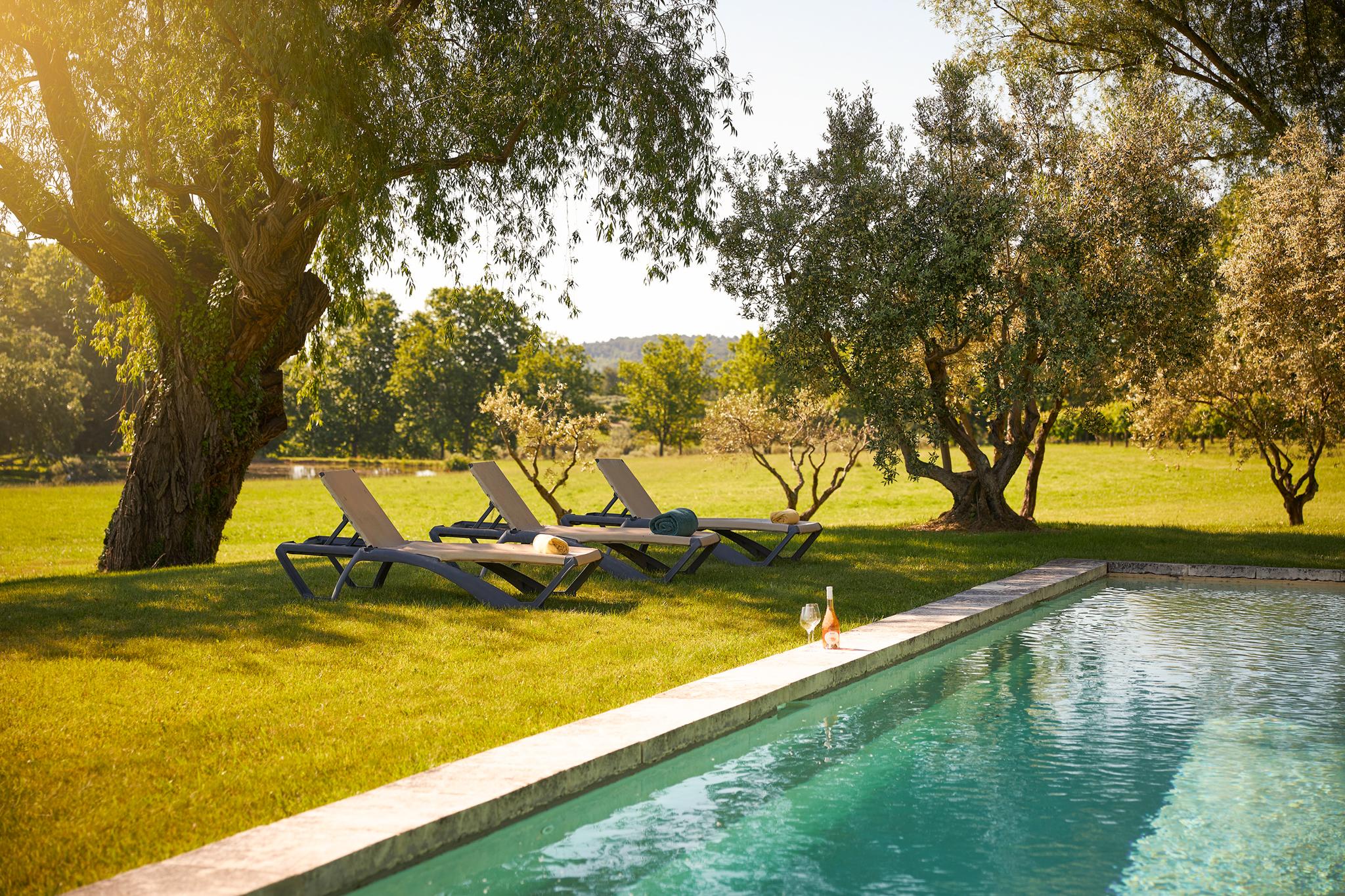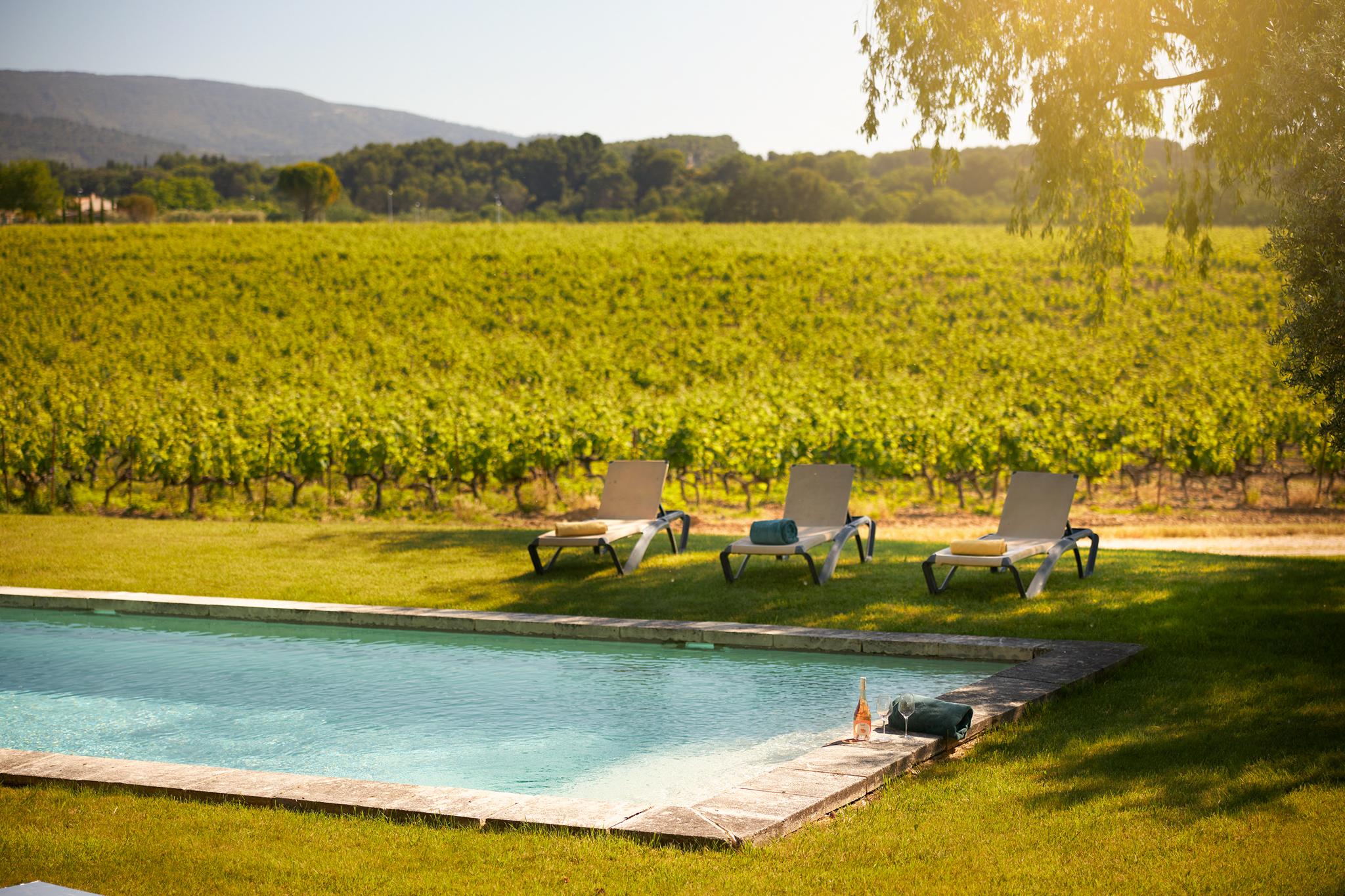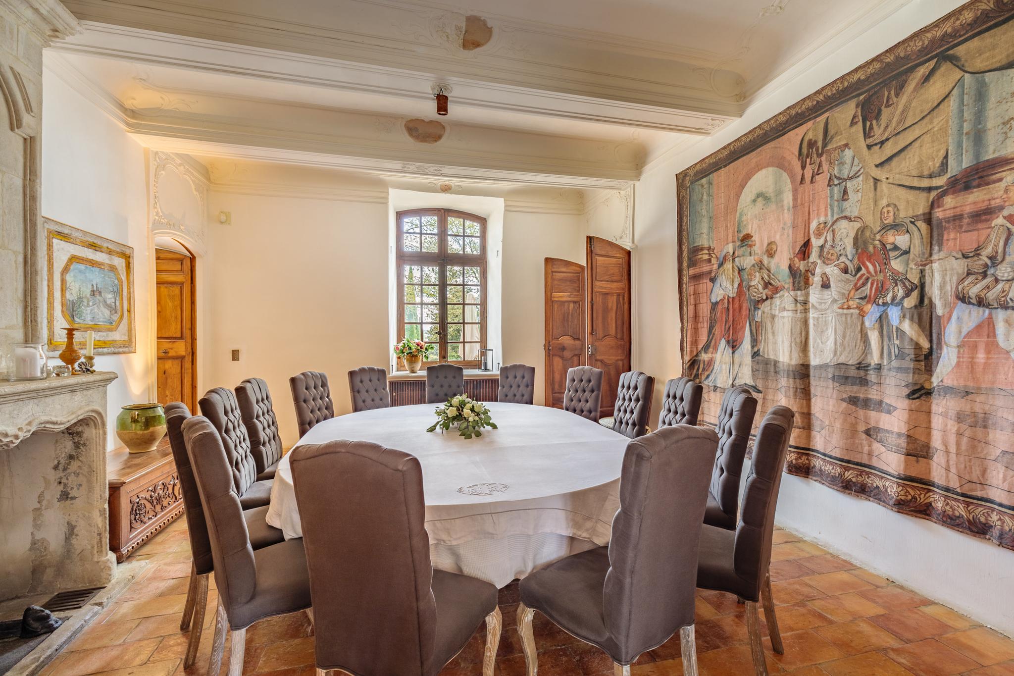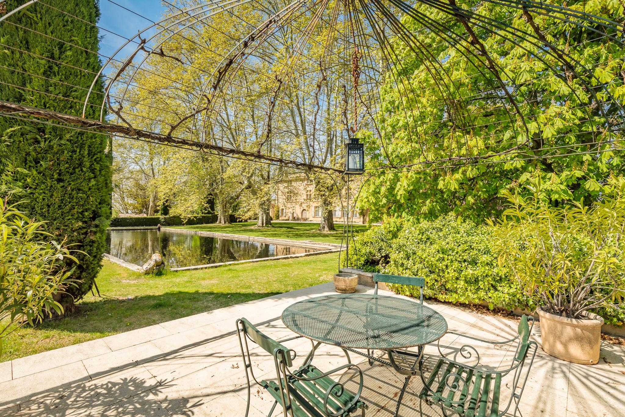 À l’extérieur, le parc, un étang et les vignes à perte de vue. Au bord de la grande piscine en pierre de 20mx7, on admire le château, les jardins et le moulin.
