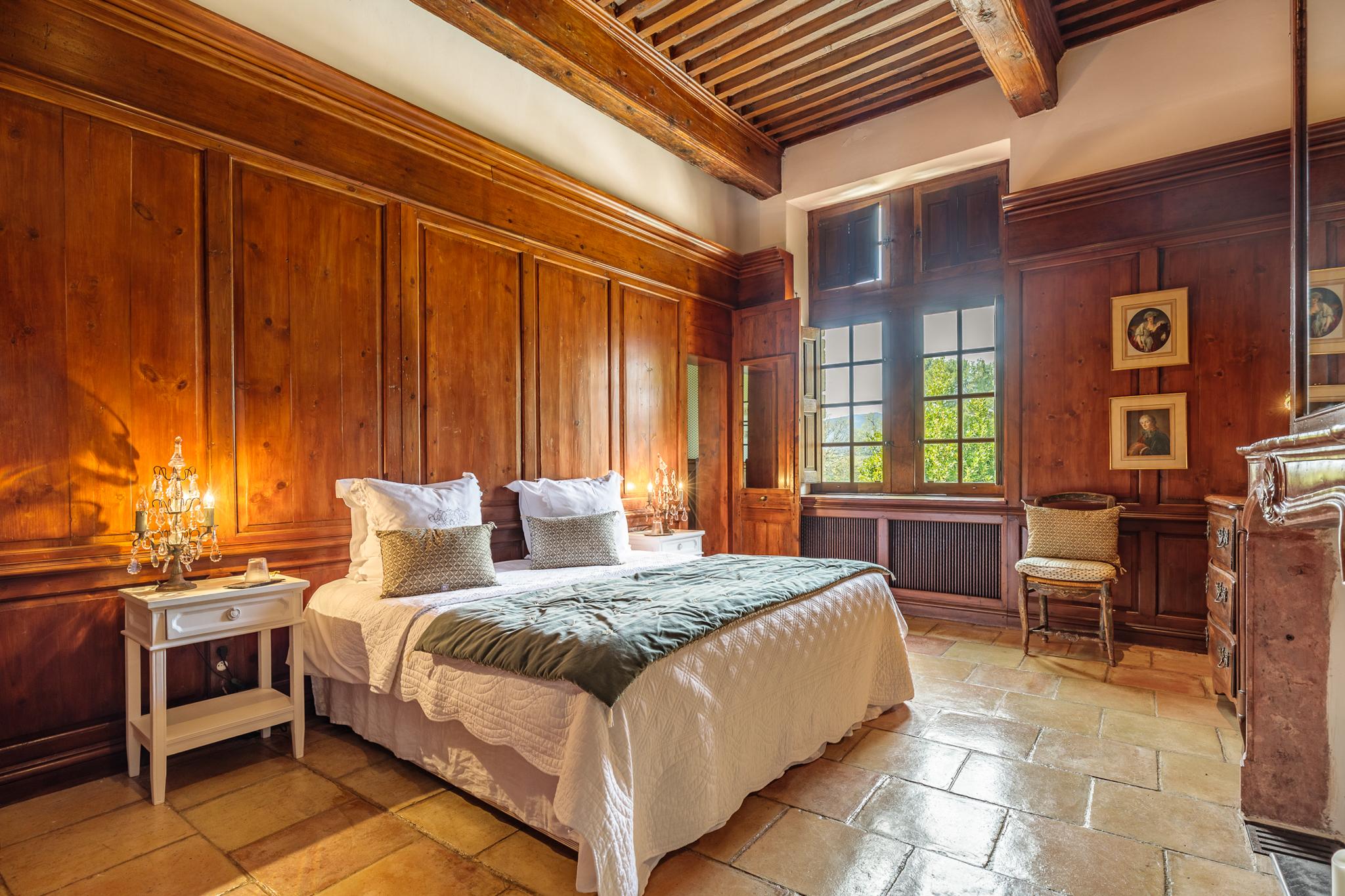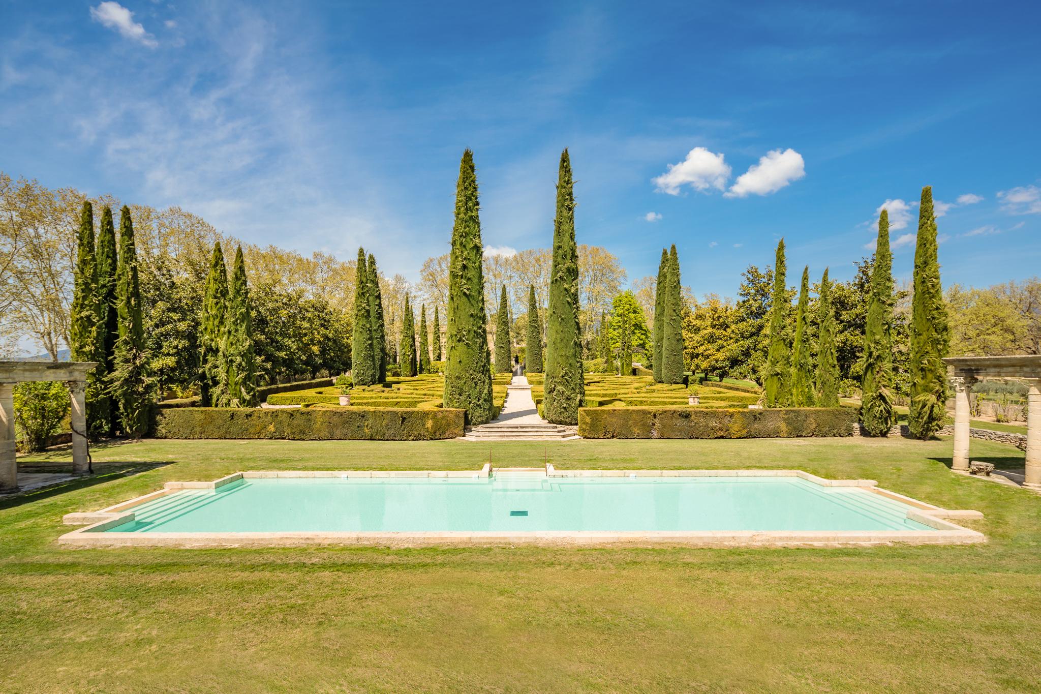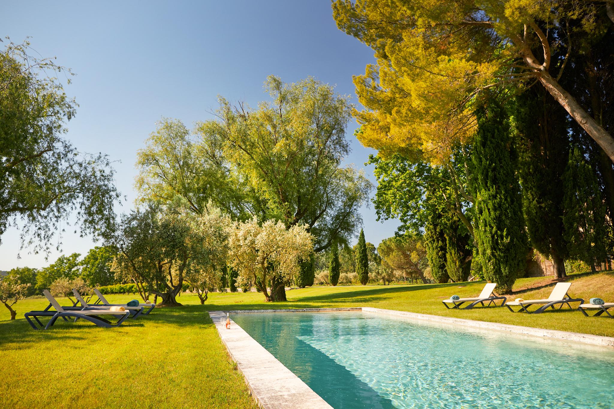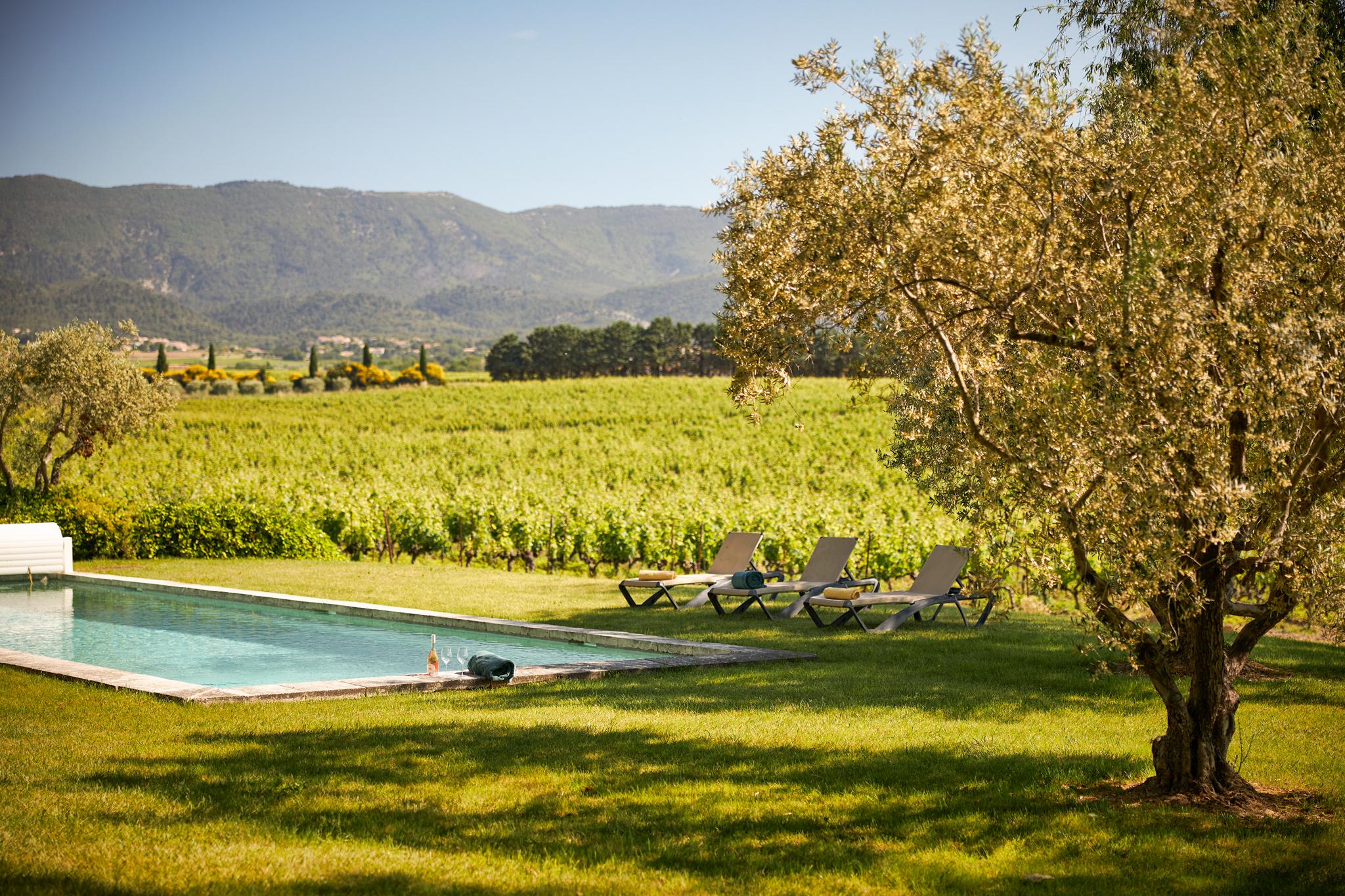 À l’extérieur, le parc, un étang et les vignes à perte de vue. Au bord de la grande piscine en pierre de 20mx7, on admire le château, les jardins et le moulin.