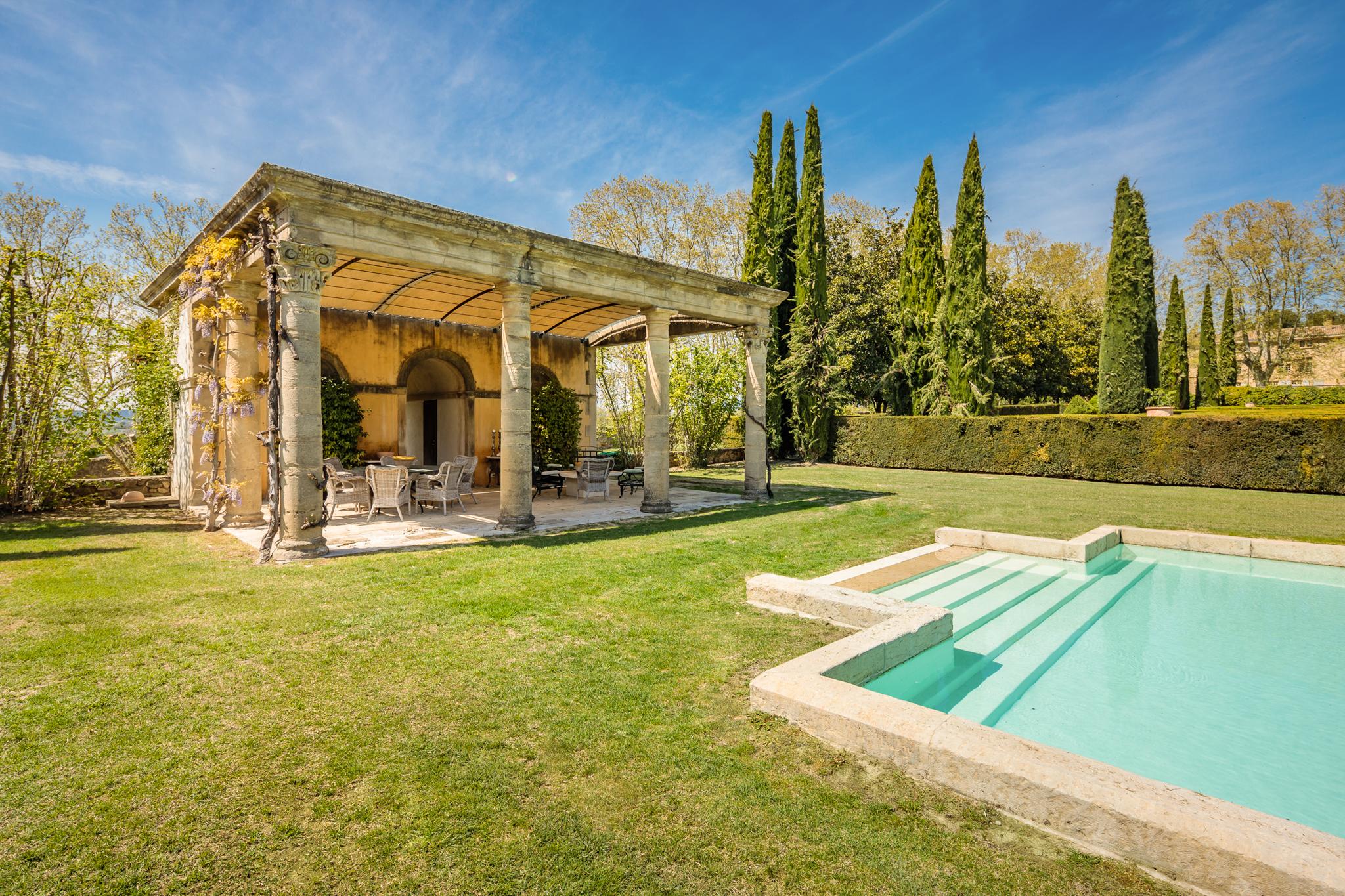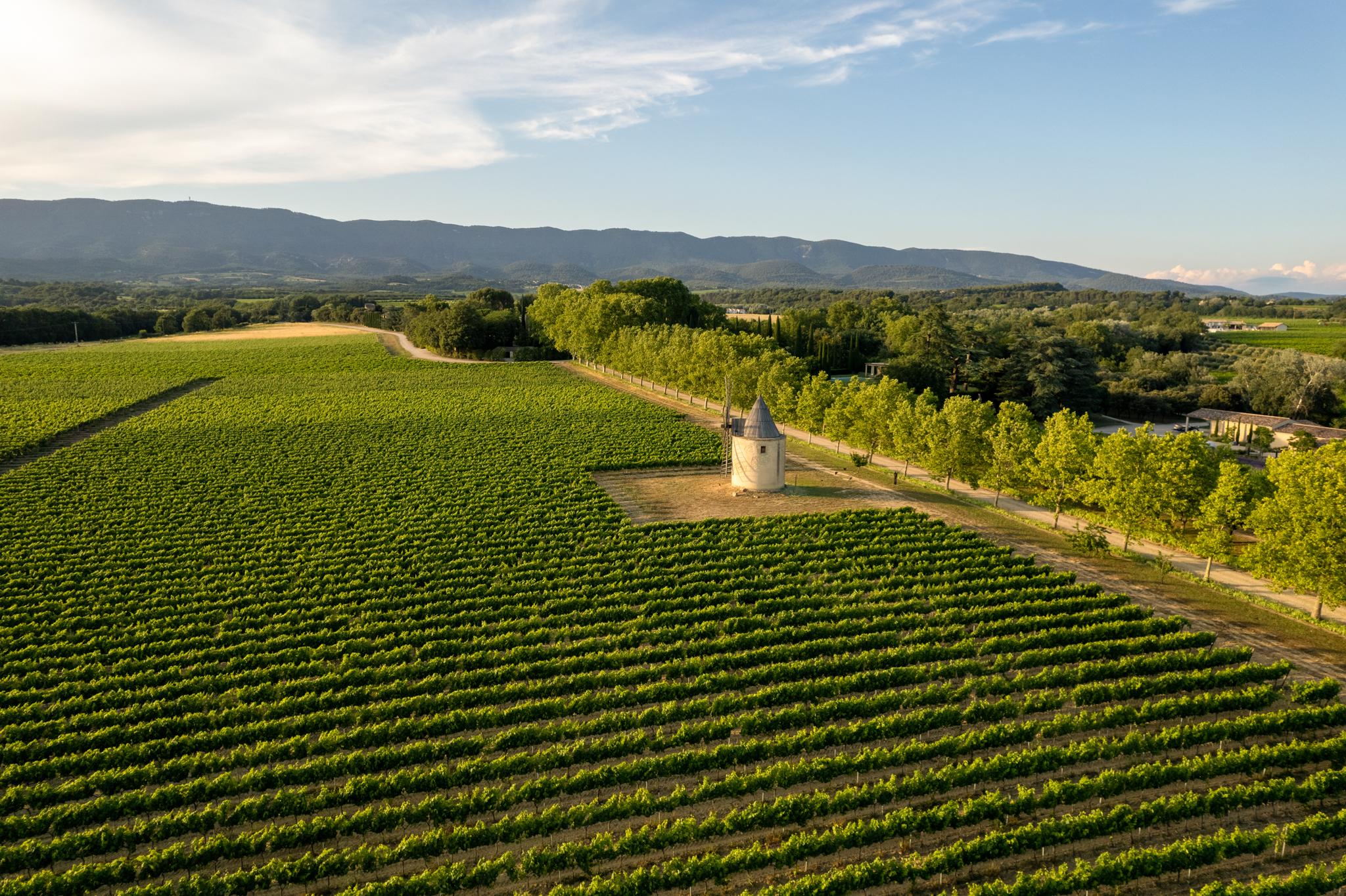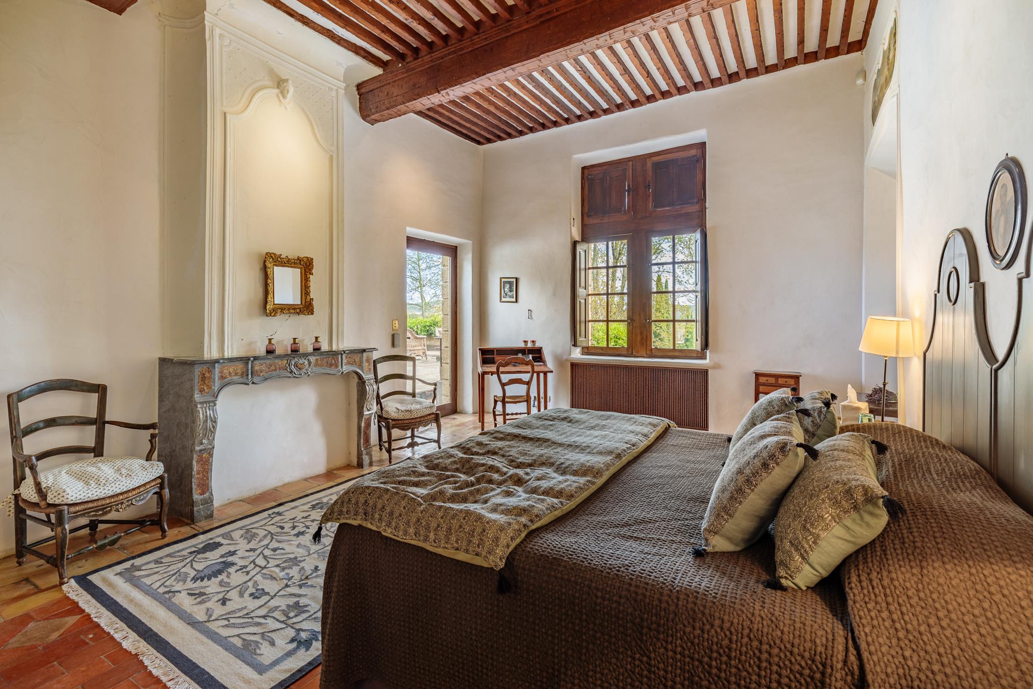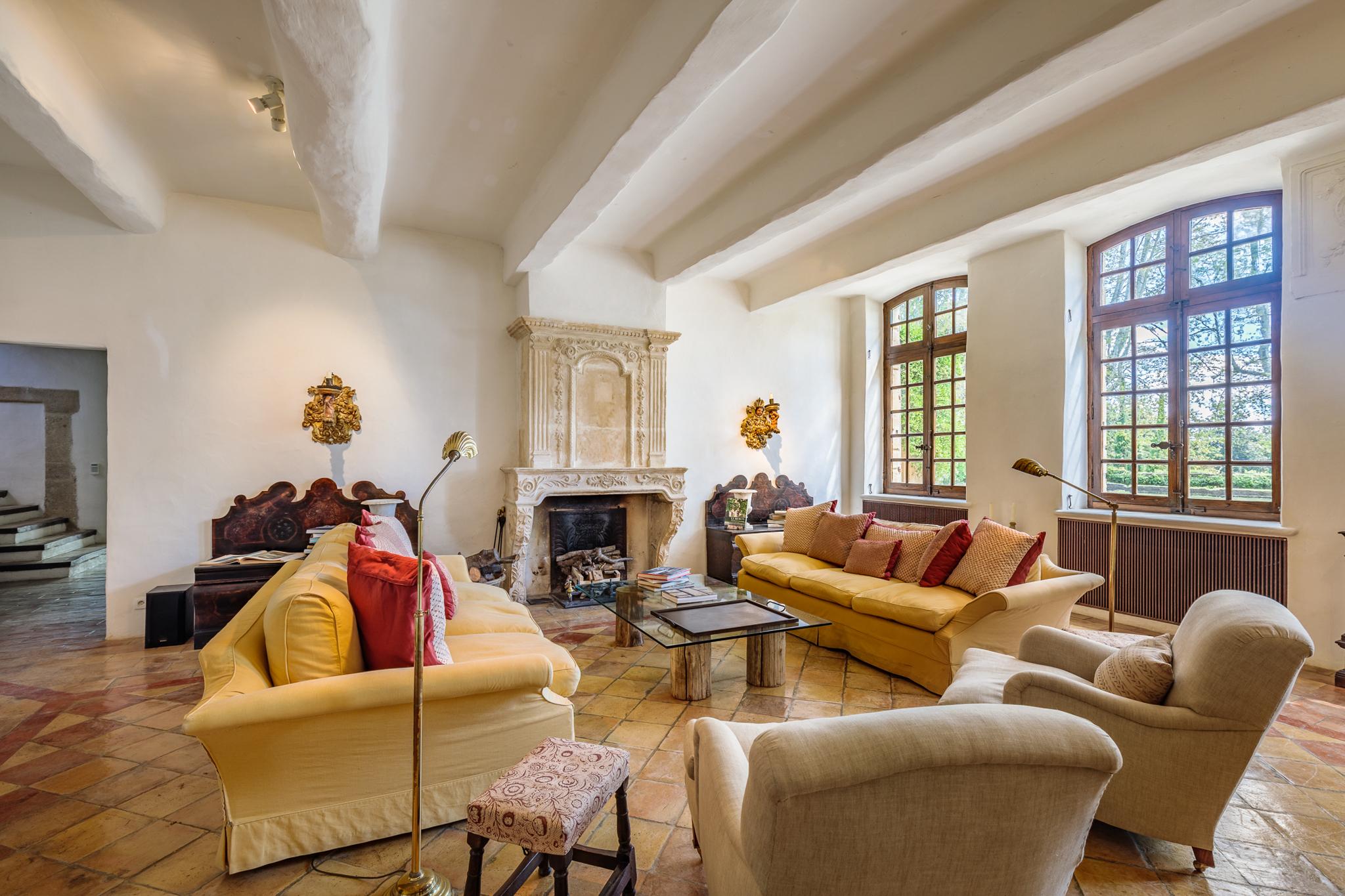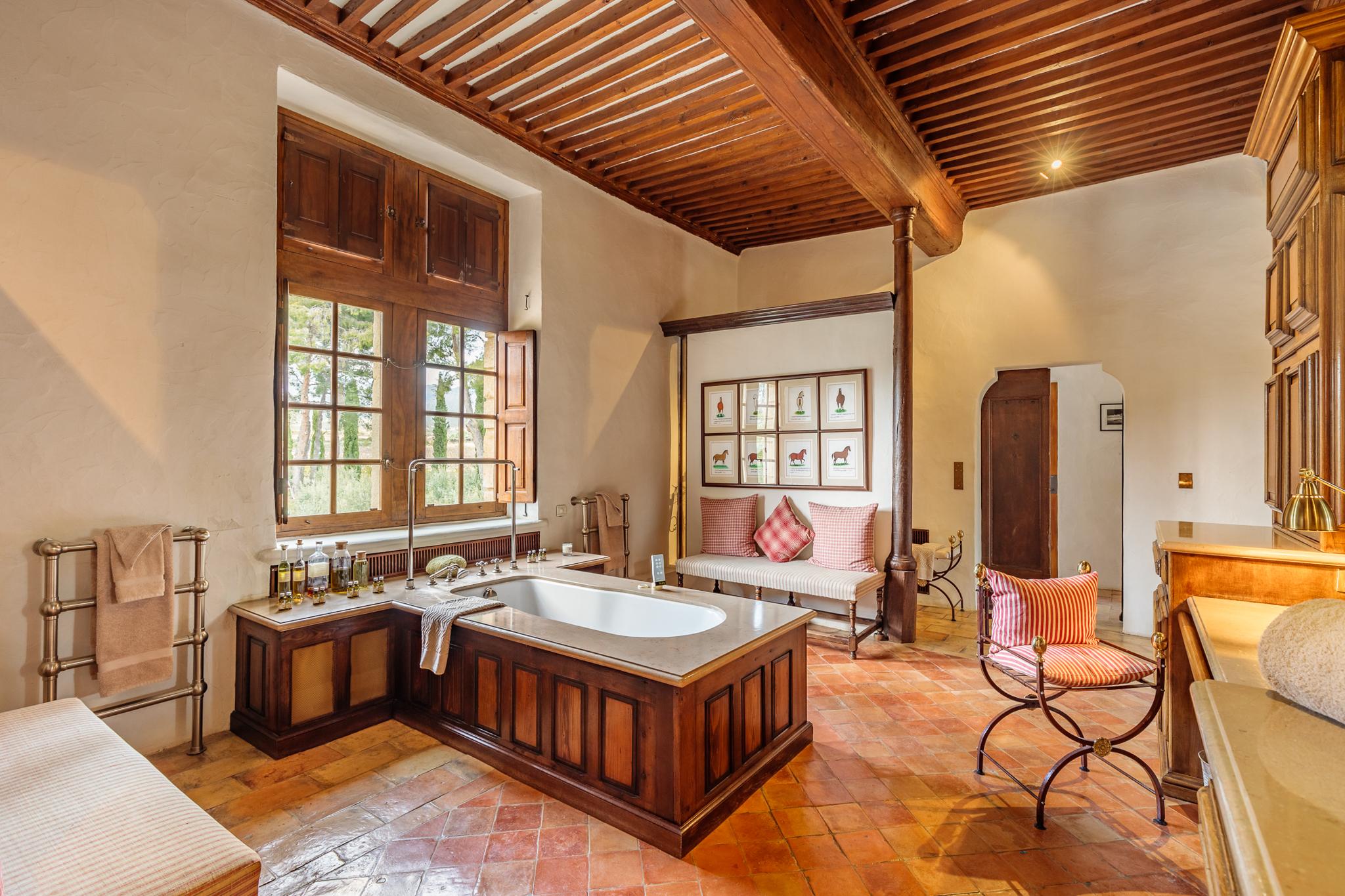 À l’extérieur, le parc, un étang et les vignes à perte de vue. Au bord de la grande piscine en pierre de 20mx7, on admire le château, les jardins et le moulin.