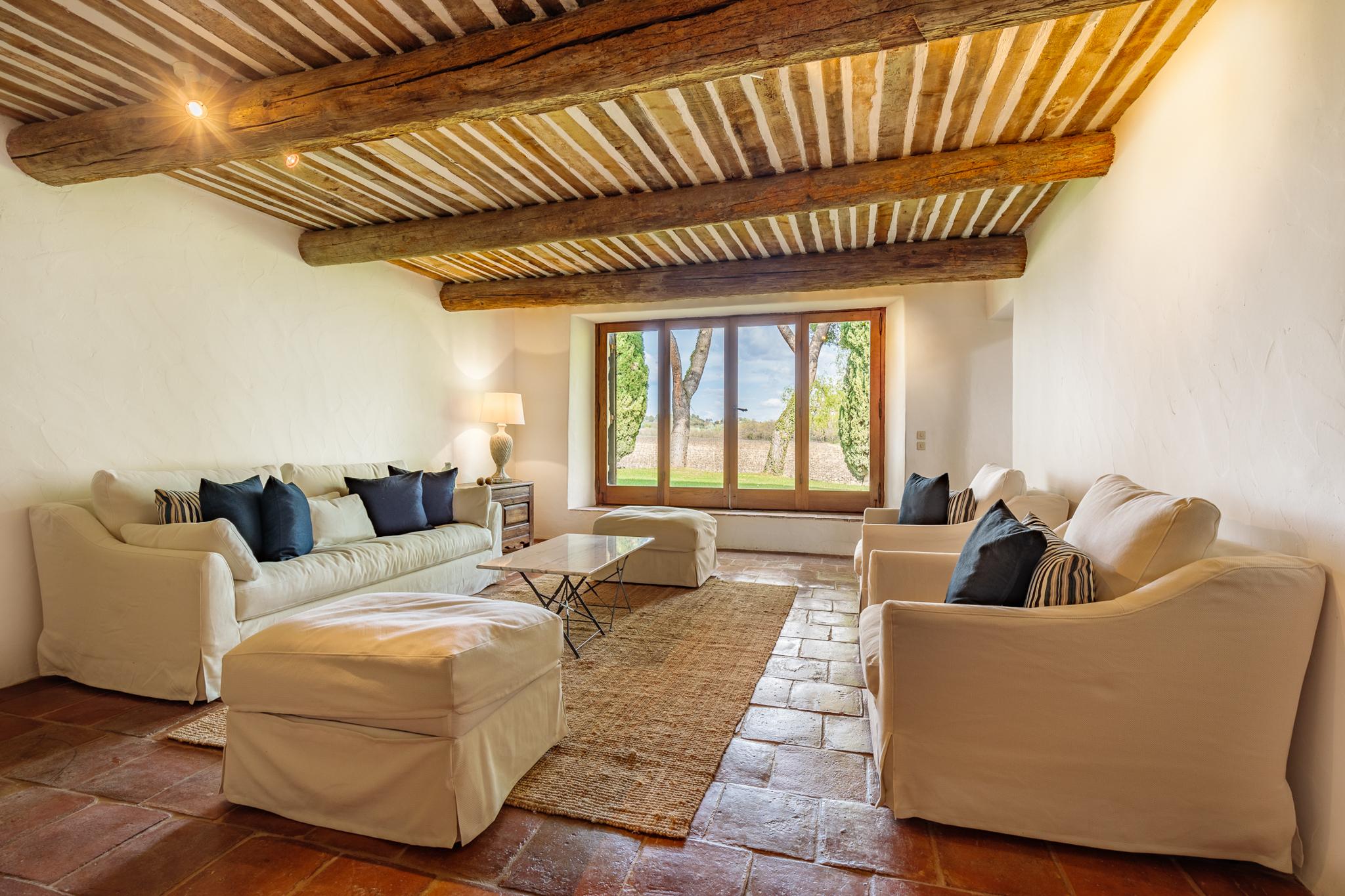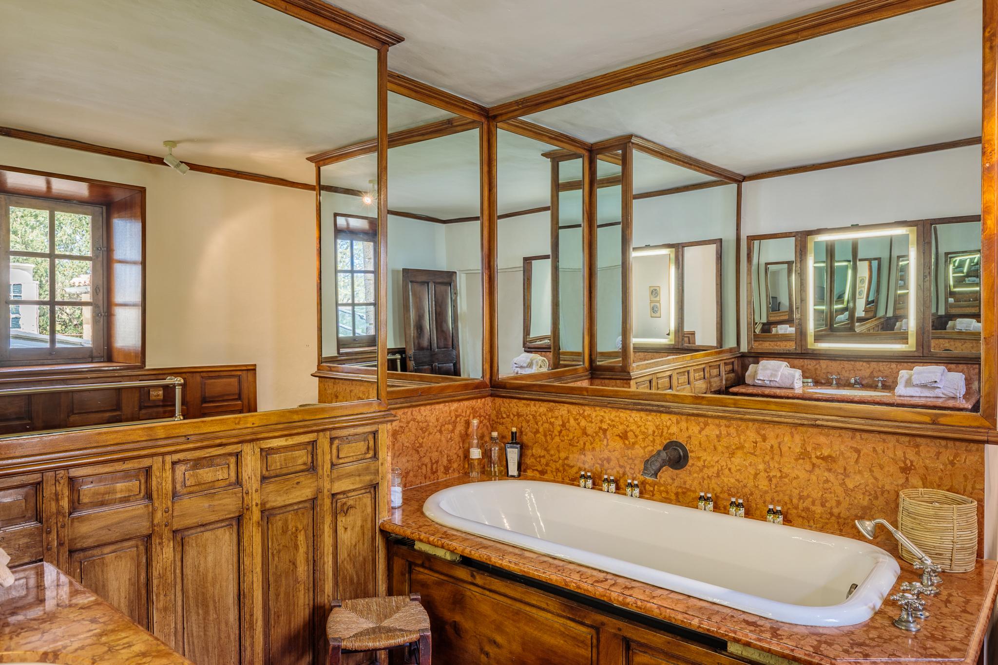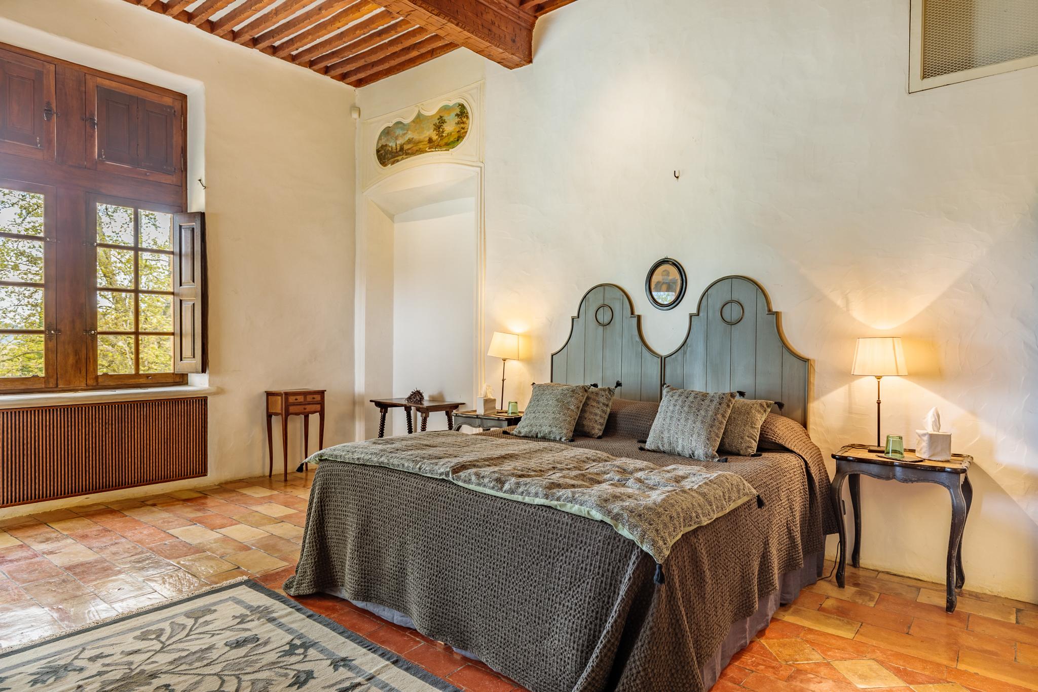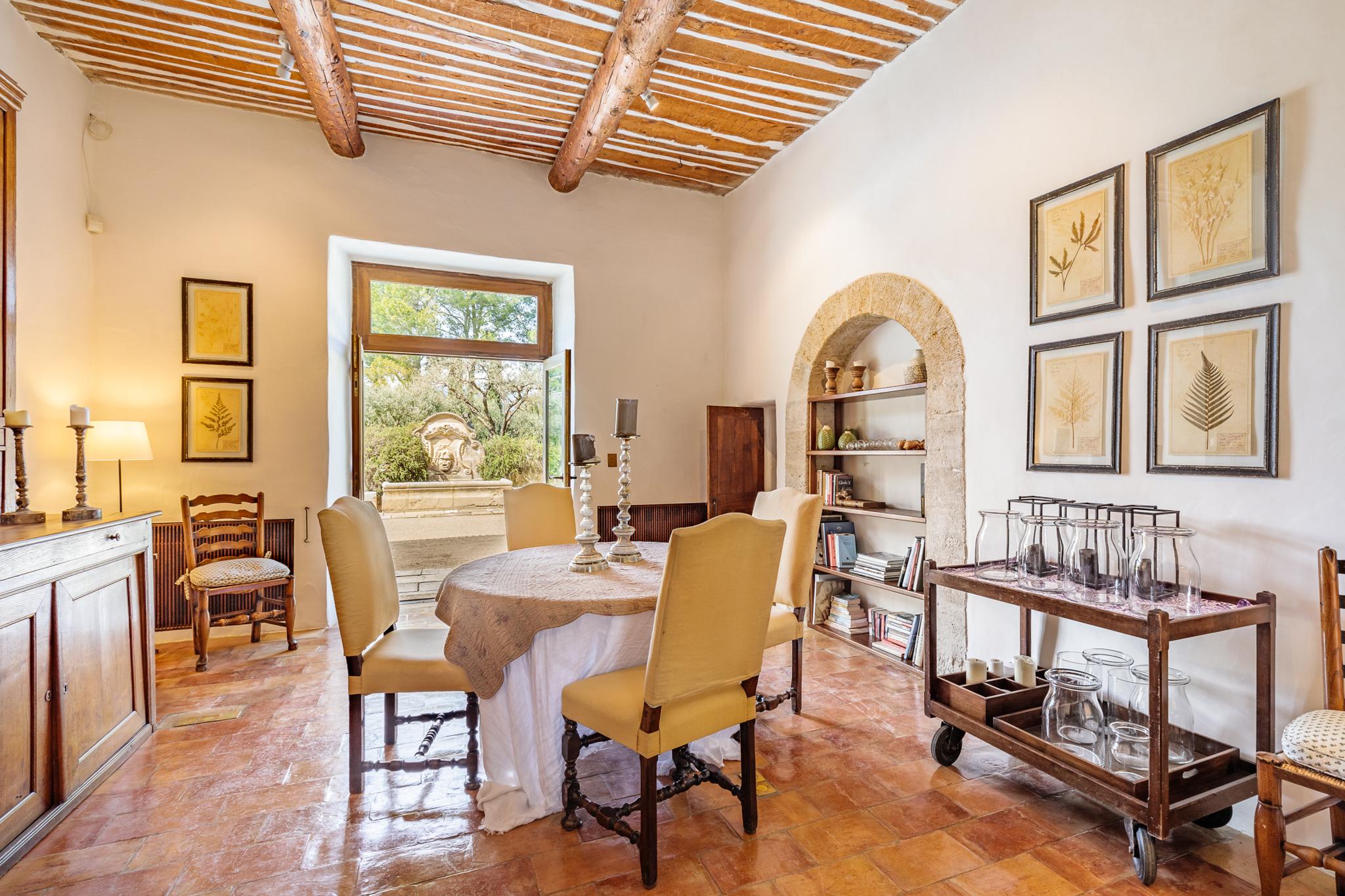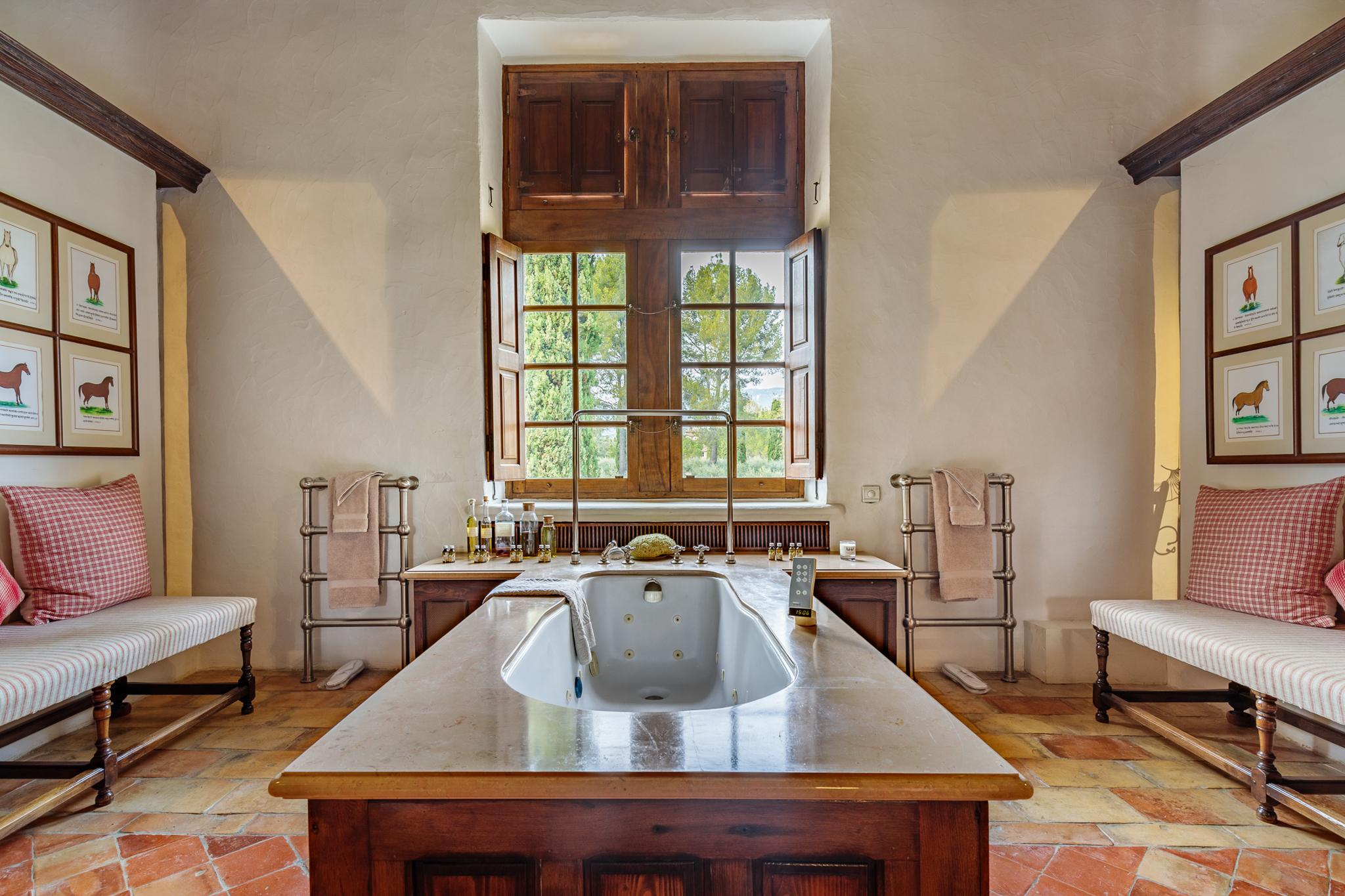 À l’extérieur, le parc, un étang et les vignes à perte de vue. Au bord de la grande piscine en pierre de 20mx7, on admire le château, les jardins et le moulin.