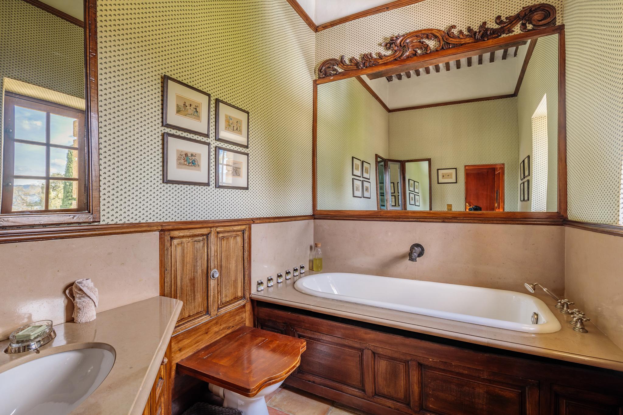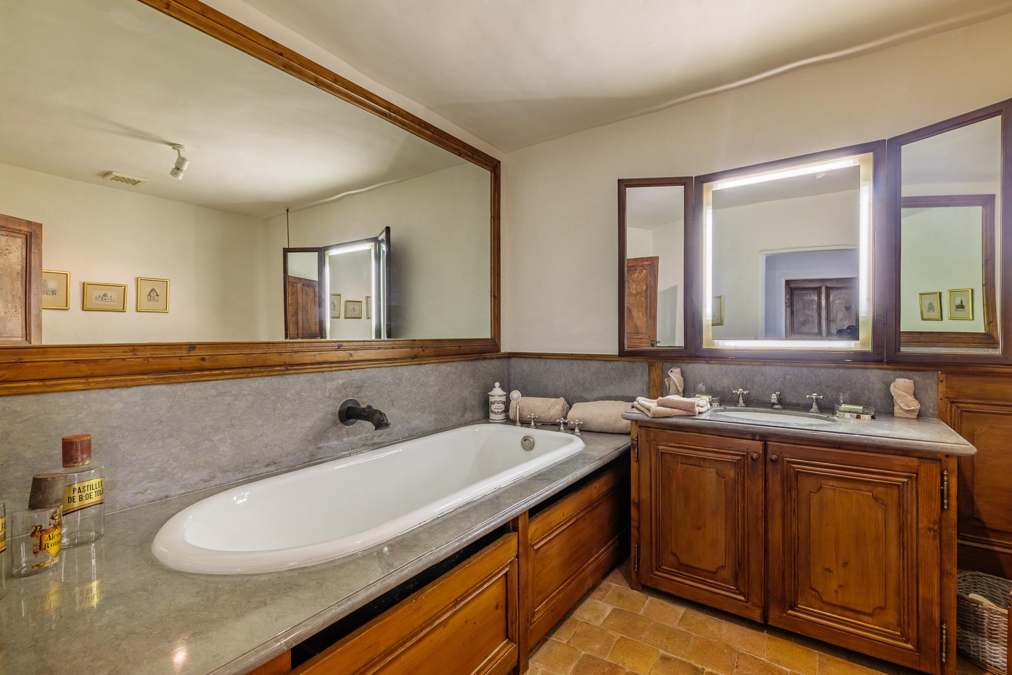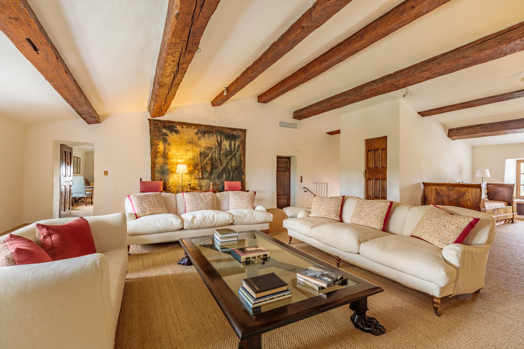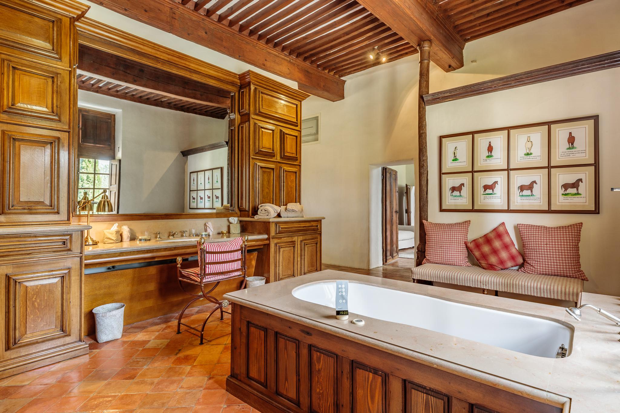 Une longue allée bordée de platanes vous conduit tout d’abord au château dont les origines remontent au début du XVIIème siècle. Les pièces sont évidemment vastes : cuisine voutée, salle à manger, salons, boudoir, pièce de billard. Sur les deux étages, 7 chambres doubles, toutes climatisées avec salle de bain privative. Une piscine intérieure sous verrière et une salle de gym complètent la bâtisse.