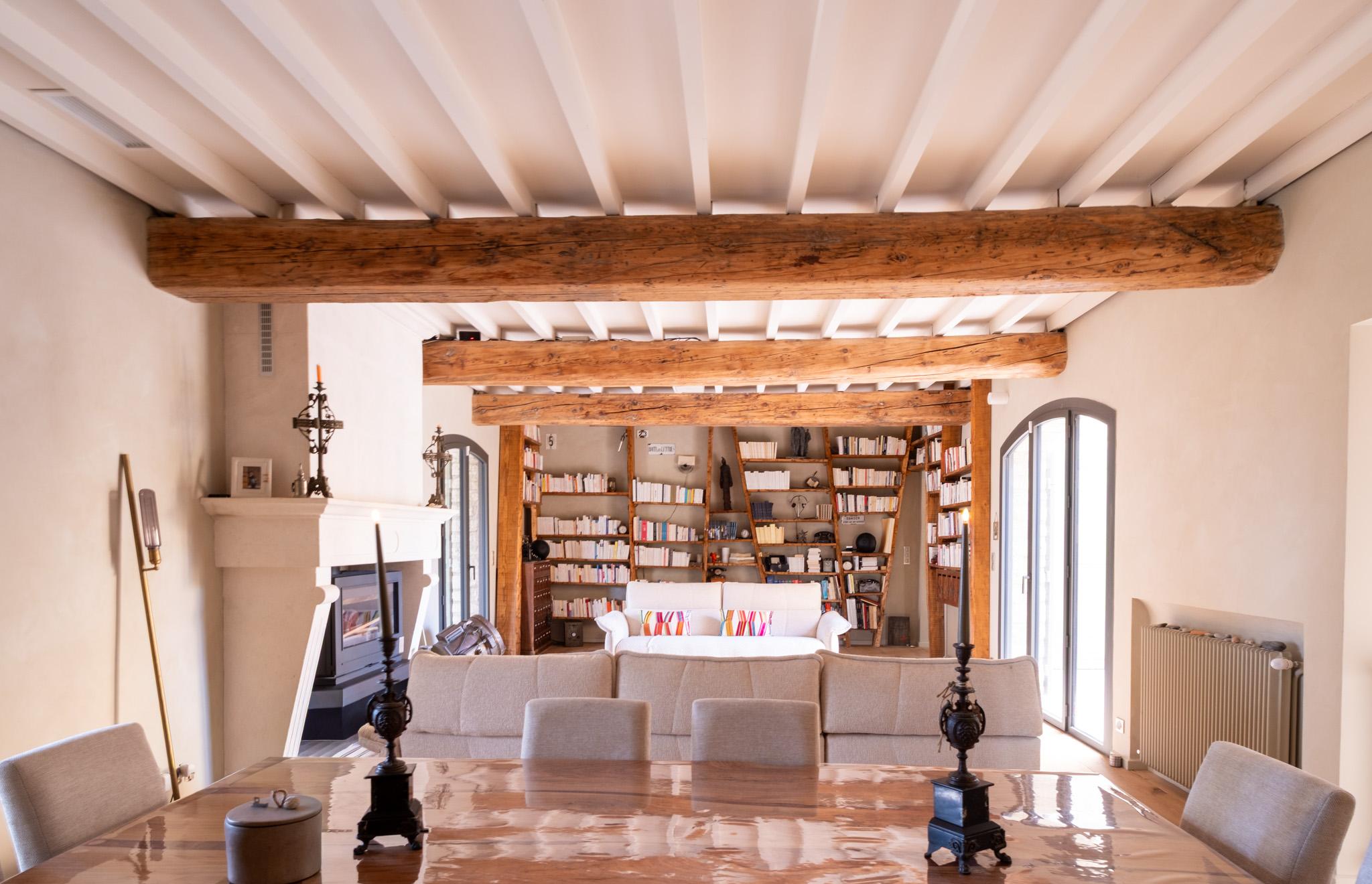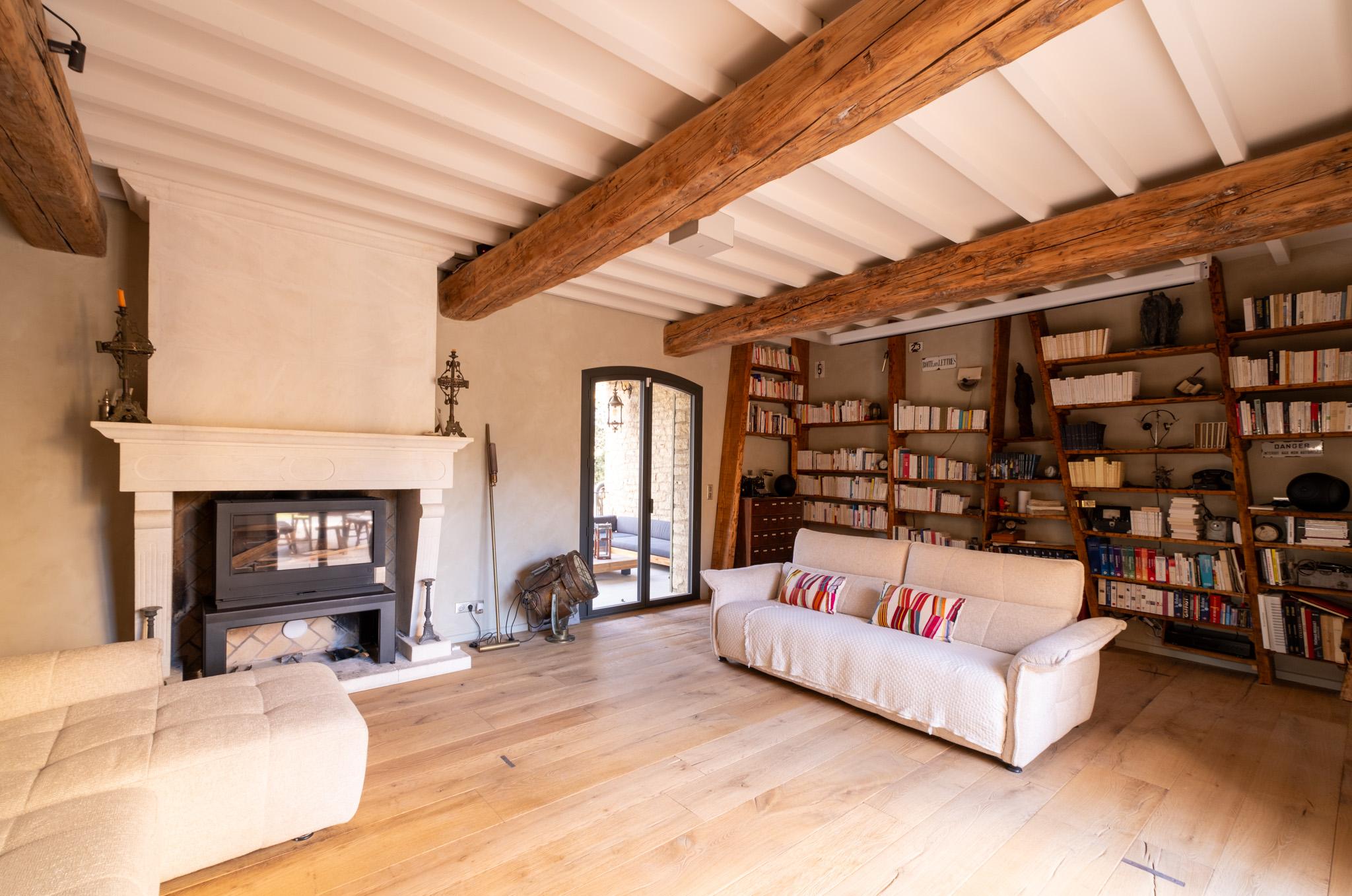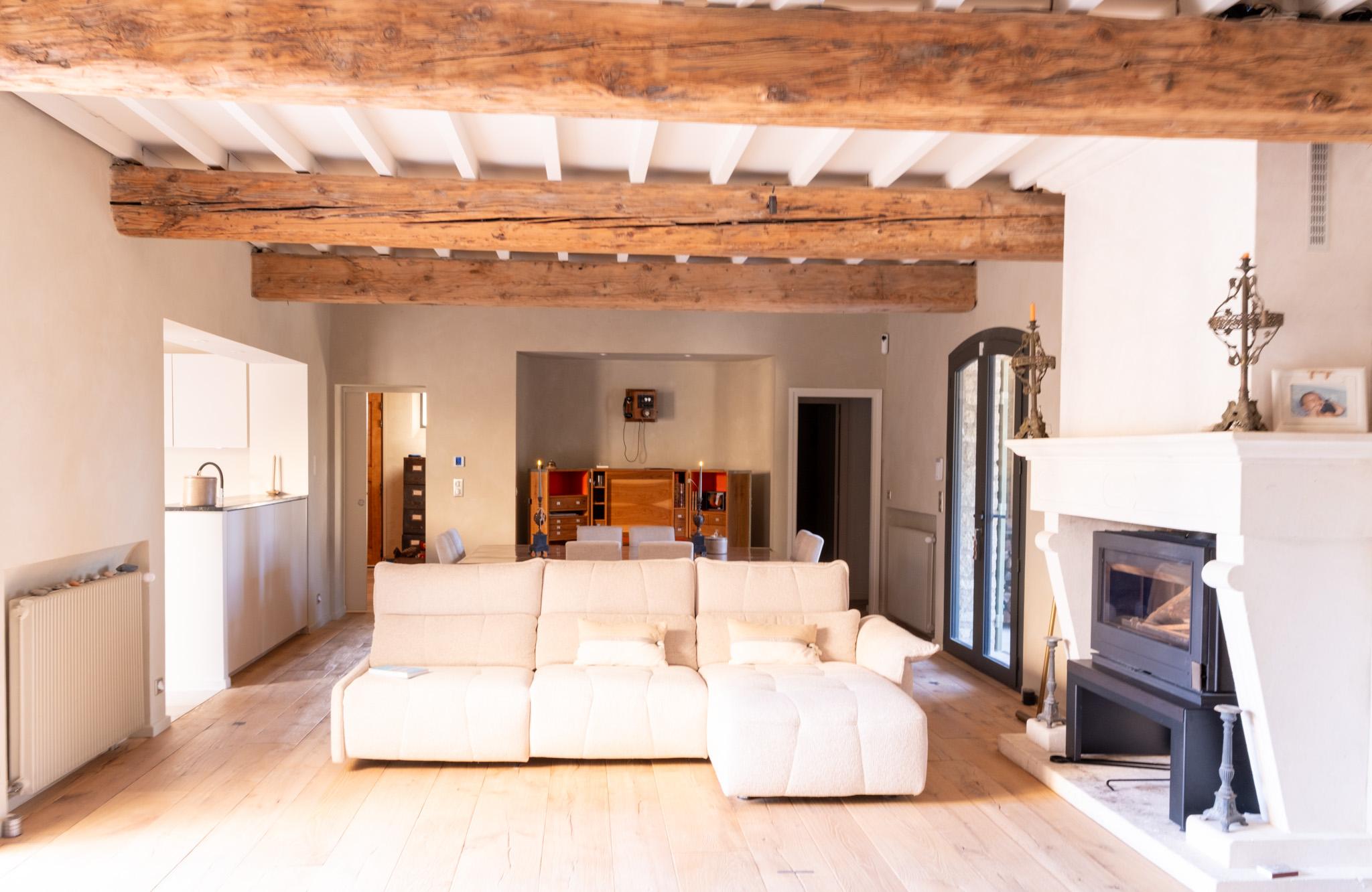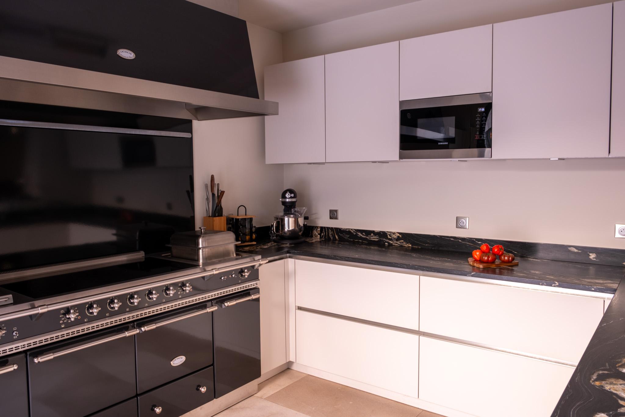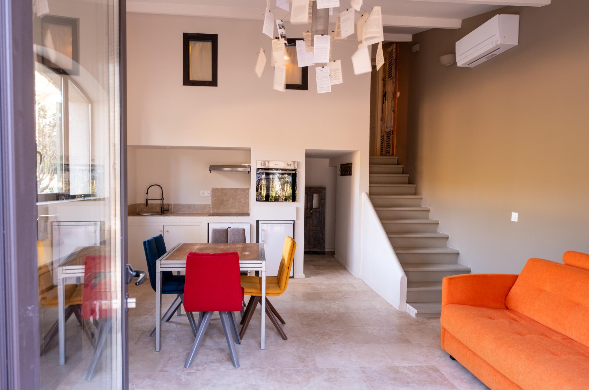 La maison, entièrement climatisée, propose de beaux volumes, baignés de lumière naturelle. Au rez de chaussée, un grand hall d’entrée mène au salon – salle à manger au magnifique parquet brut et insert cheminée. La cuisine ouverte propose des équipements haut de gamme tel un piano Lacanche et tout ce dont vous aurez besoin pour votre séjour. Au choix, deux agréables terrasses où déjeuner et dîner selon la saison.