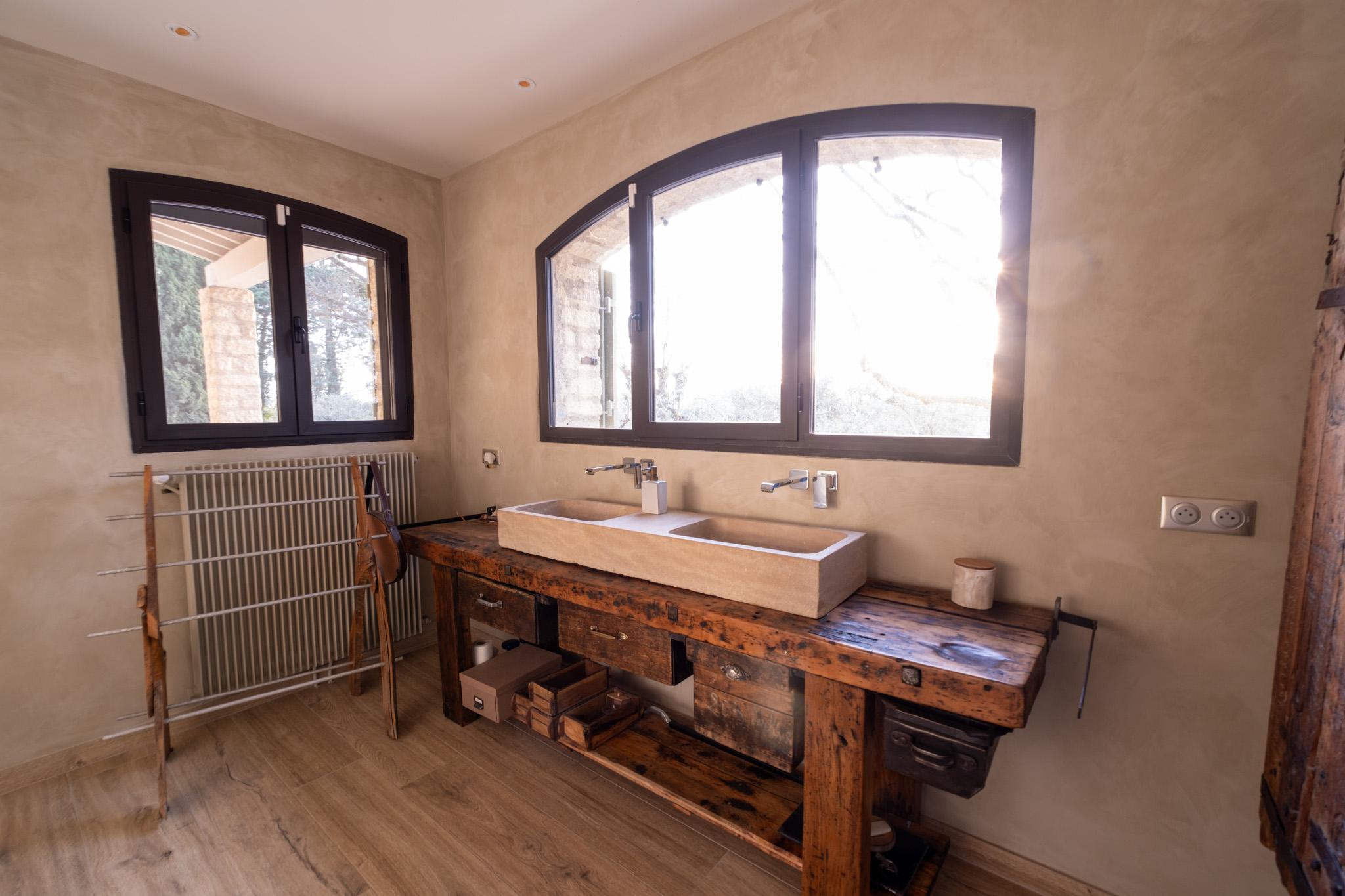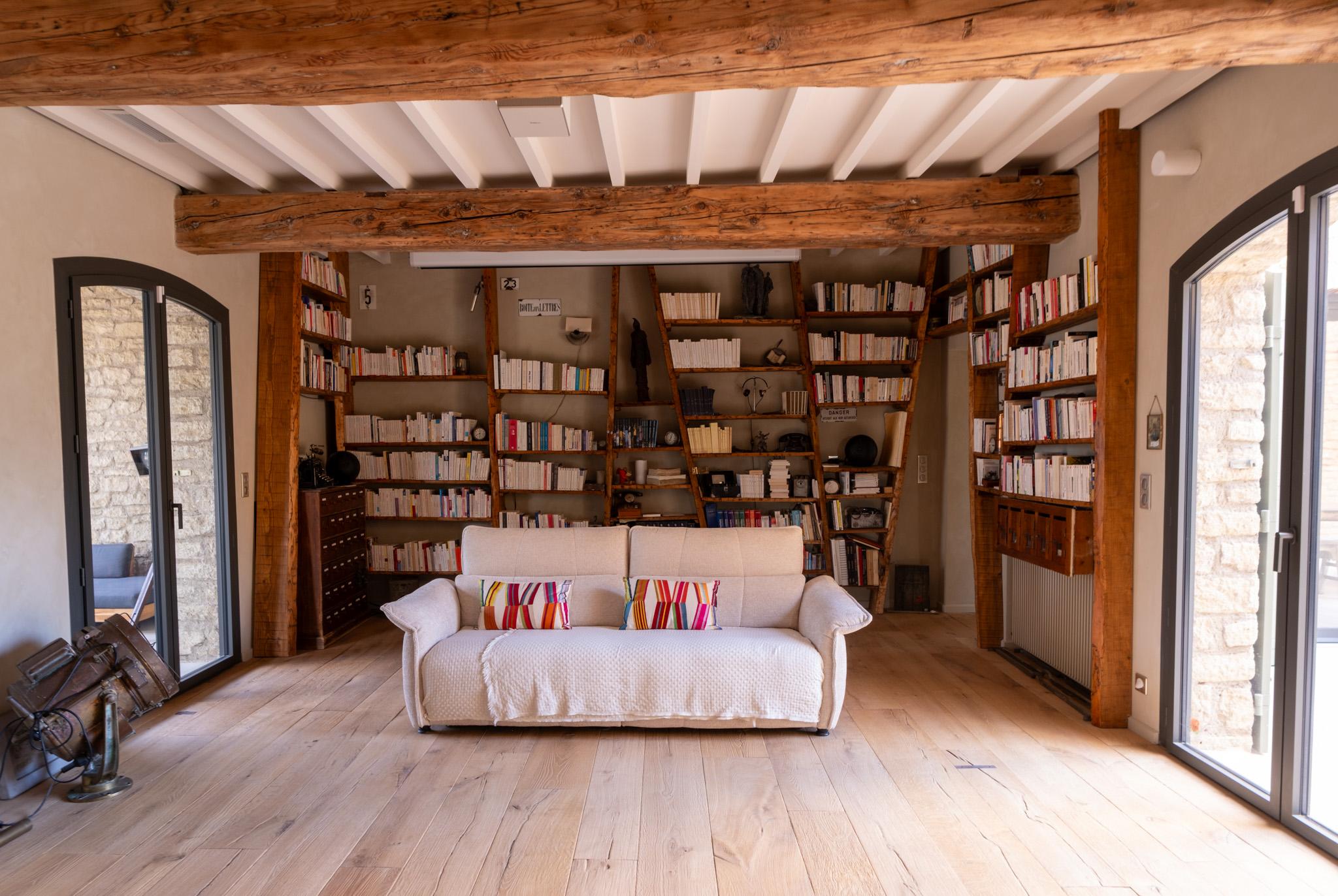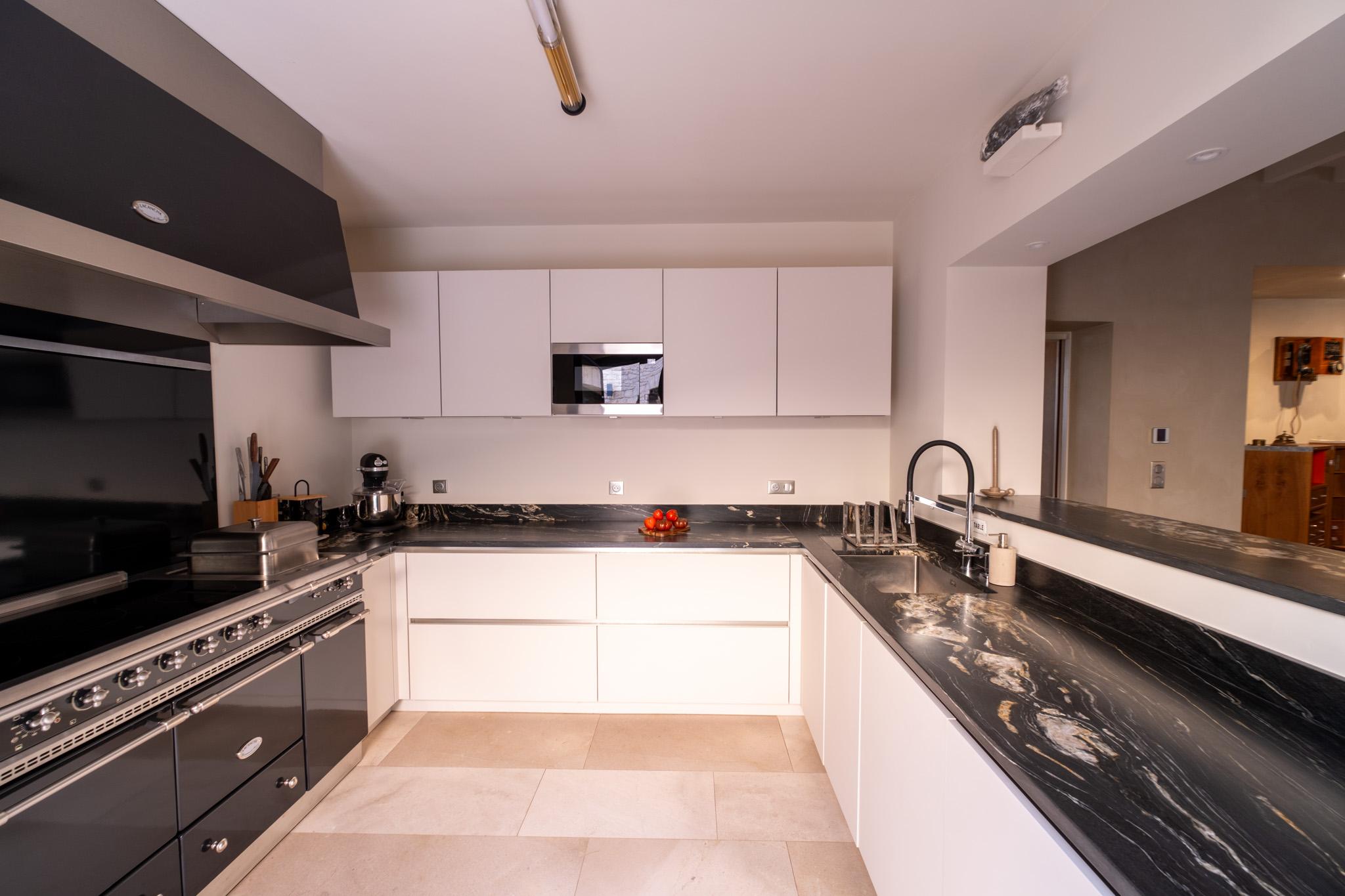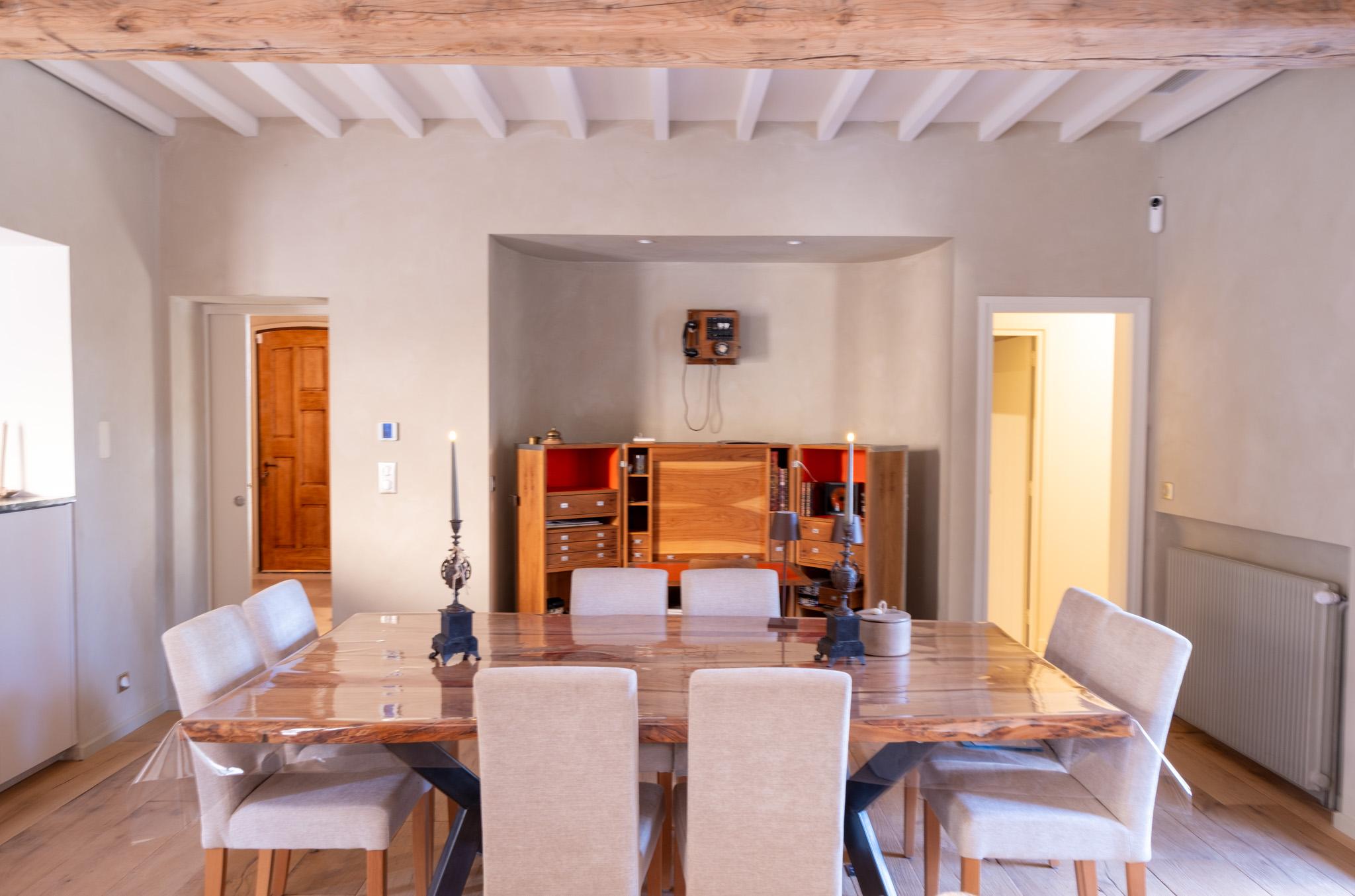 La maison, entièrement climatisée, propose de beaux volumes, baignés de lumière naturelle. Au rez de chaussée, un grand hall d’entrée mène au salon – salle à manger au magnifique parquet brut et insert cheminée. La cuisine ouverte propose des équipements haut de gamme tel un piano Lacanche et tout ce dont vous aurez besoin pour votre séjour. Au choix, deux agréables terrasses où déjeuner et dîner selon la saison.