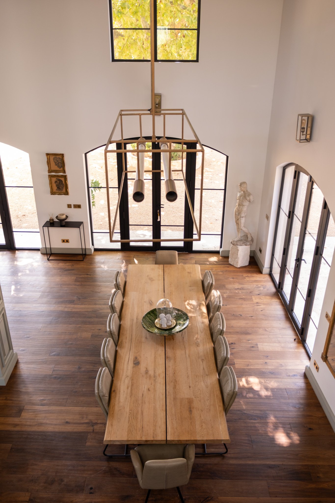 The ground floor, with its impressive entrance hall, offers living rooms with superb high ceilings. Guests can enjoy a large, fully equipped open-plan kitchen, a magnificent dining table that seats 12, and a comfortable lounge area with a TV and fireplace.