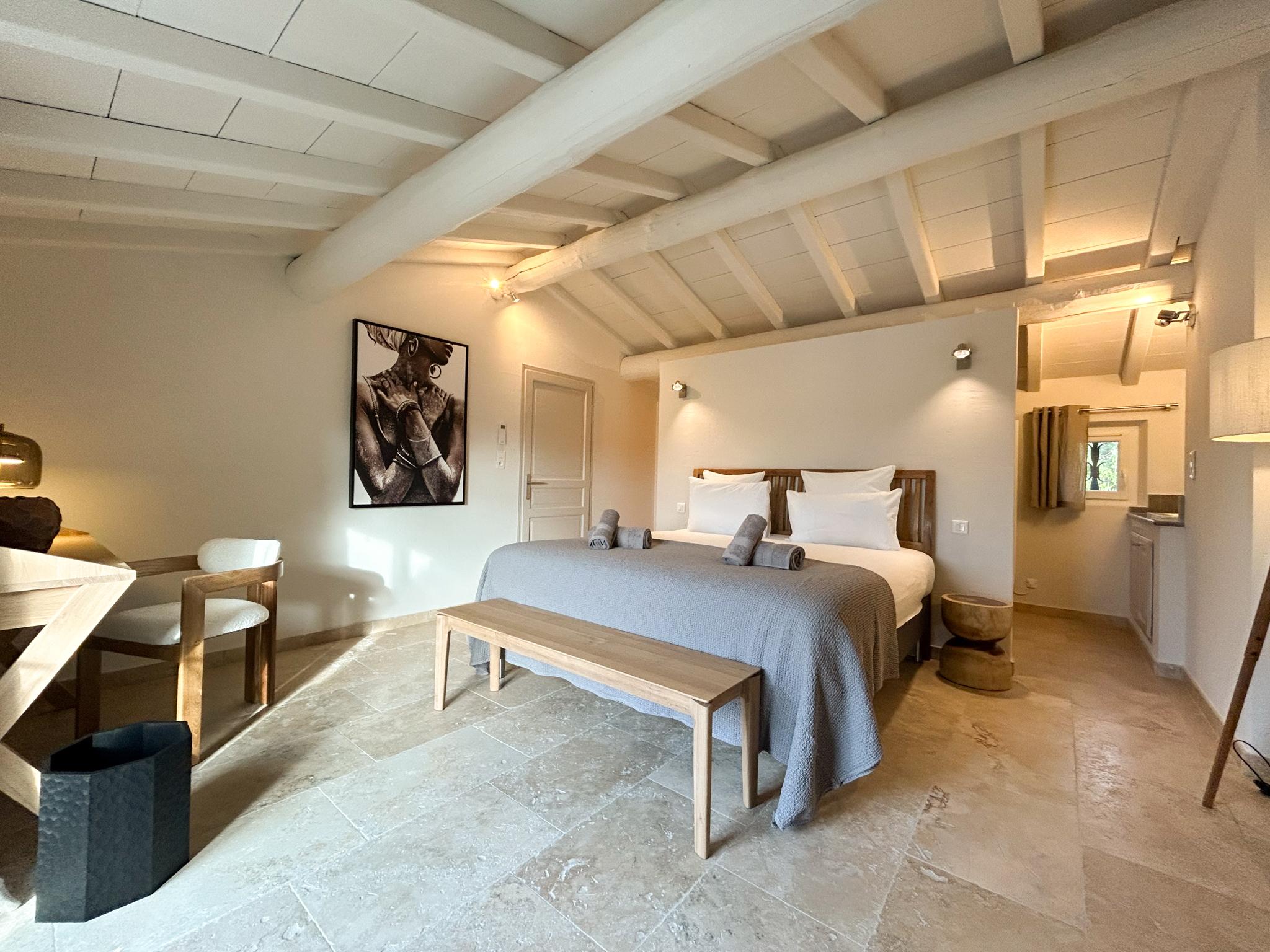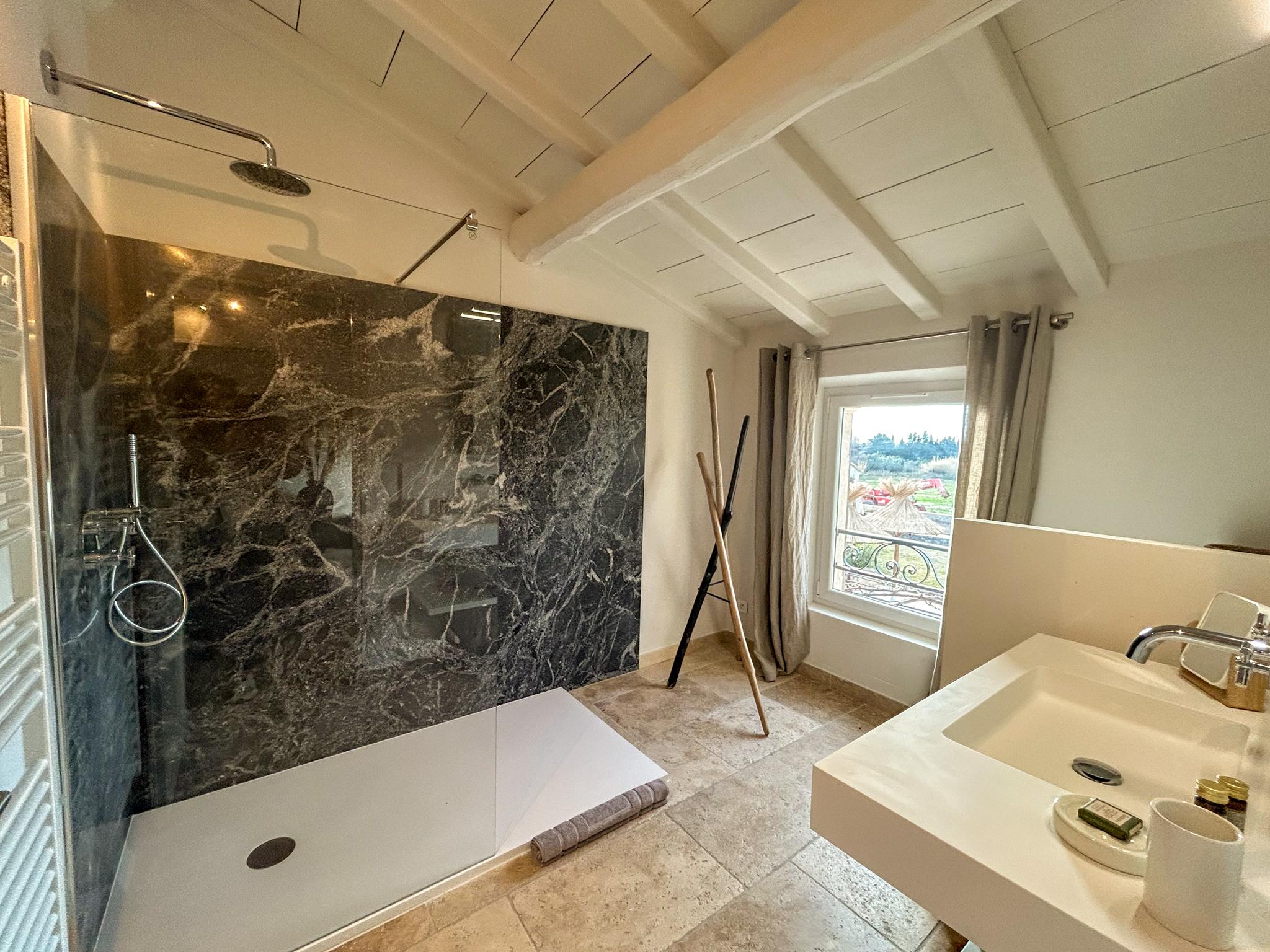 The fifth bedroom is located in an outbuilding near the swimming pool with a 180x200cm bed and private bathroom (shower, single sink, toilet).